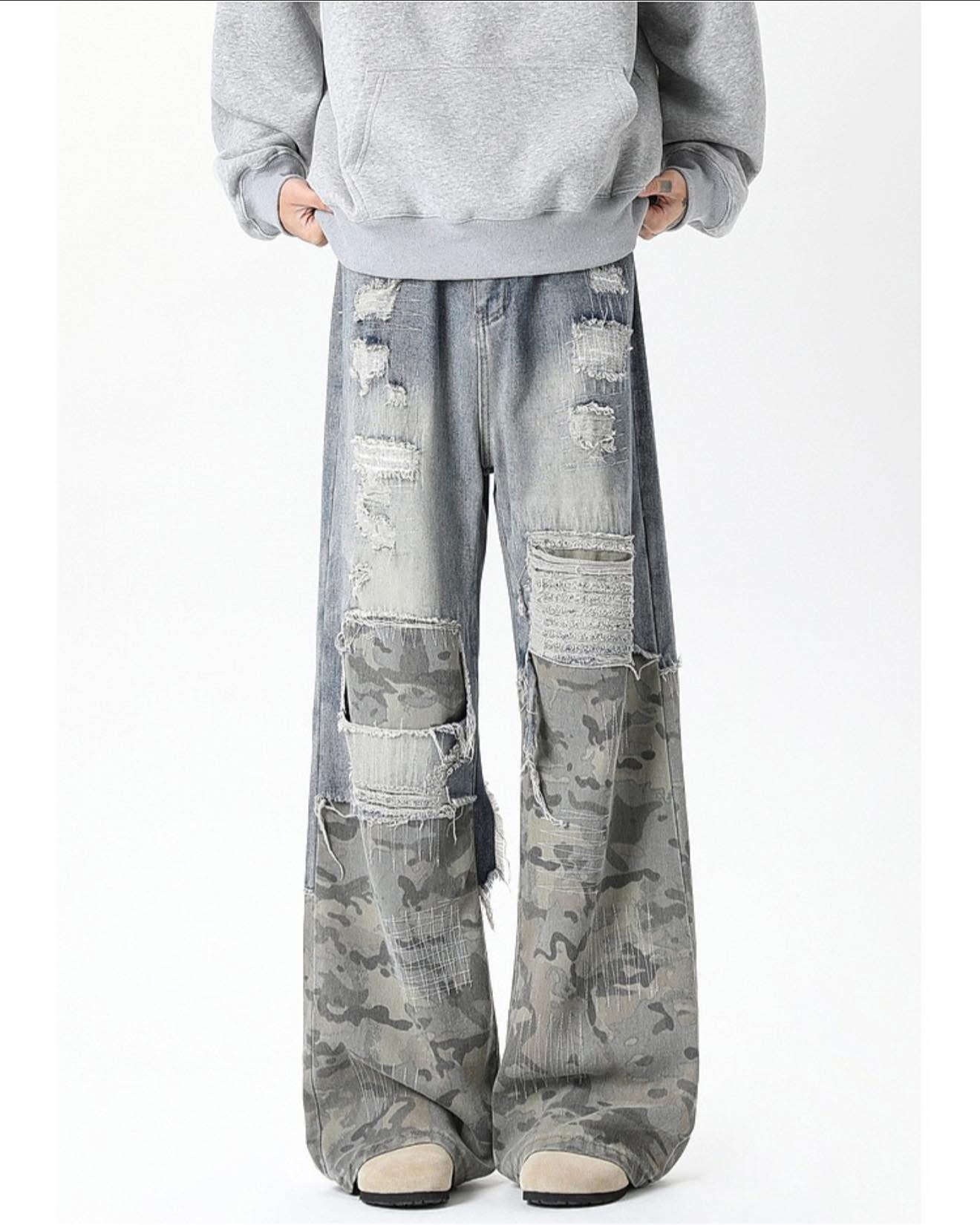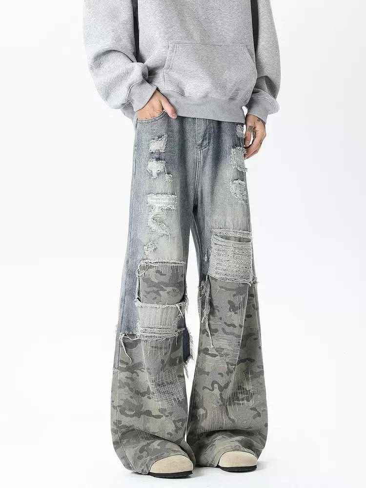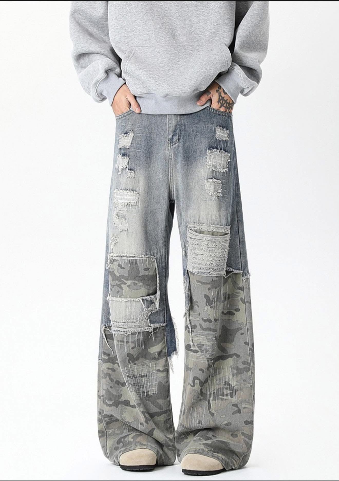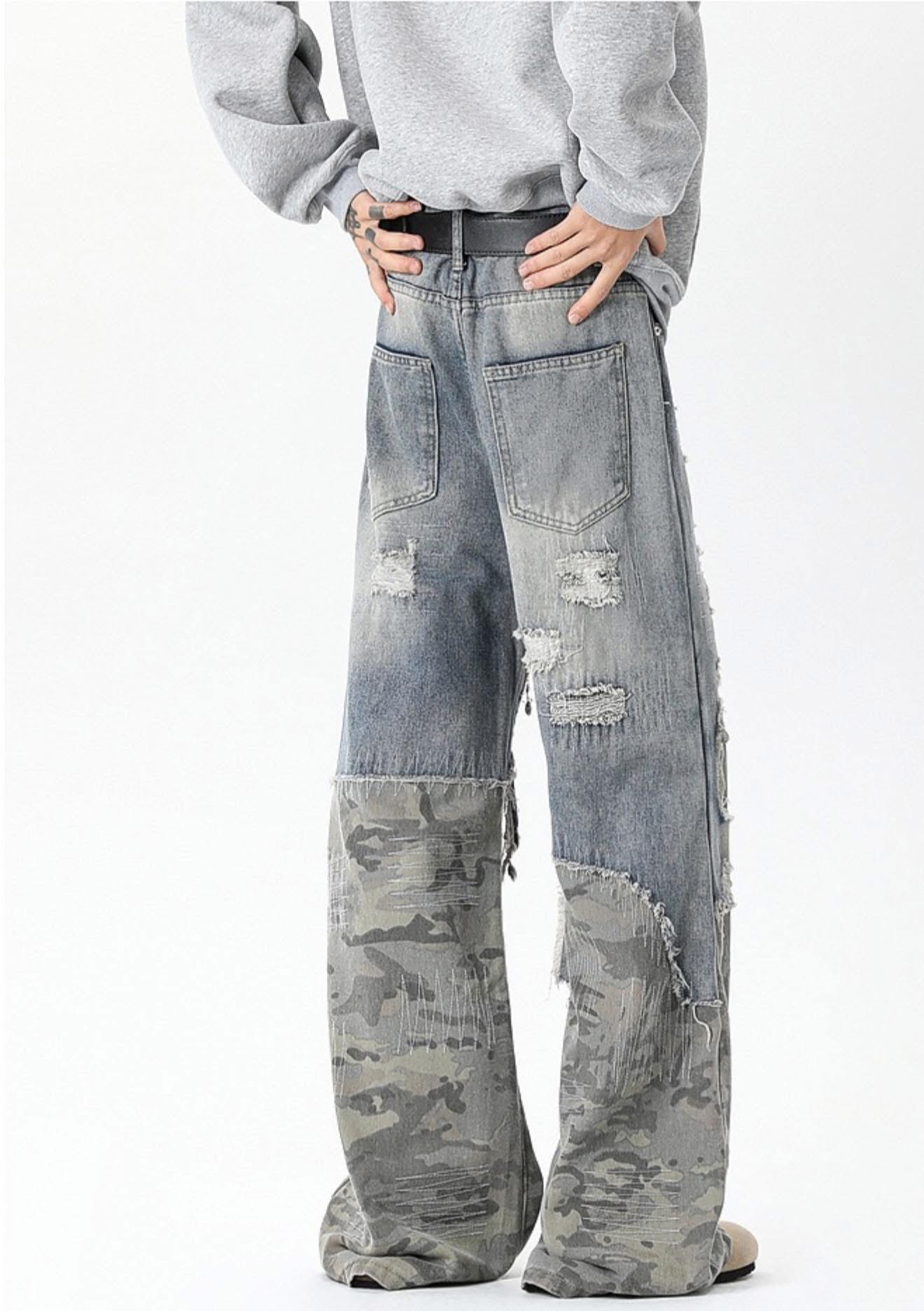Distressed Patchwork Wide-Leg Jeans